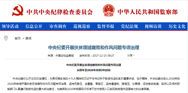 2017年7月,中央纪委召开了12万纪检监察干部参加的扶贫领域监督执纪问责工作电视电话会,提出重点查处贯彻中央脱贫工作决策部署不坚决不到位,弄虚作假、阳奉阴违的行为,坚决纠正以形式主义、官僚主义对待扶贫工作、做表面文章的问题,严肃查处贪污挪用、截留私分,优亲厚友、虚报冒领,雁过拔毛、强占掠夺问题,对胆敢向扶贫资金财物“动奶酪”的严惩不贷。