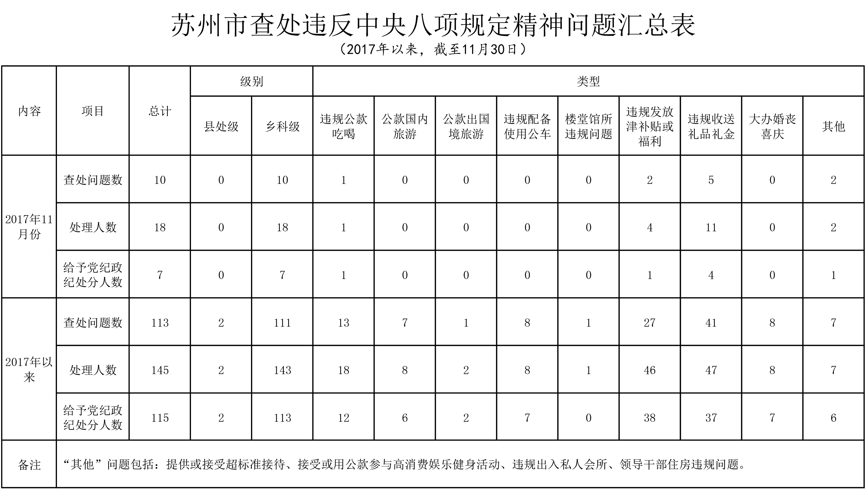 为掌握全市贯彻落实中央八项规定精神情况,苏州市纪委在各市区、市级机关、市属单位建立了落实中央八项规定精神情况月报制度。2017年以来,截止11月30日,全市查处违反中央八项规定精神问题情况如下: