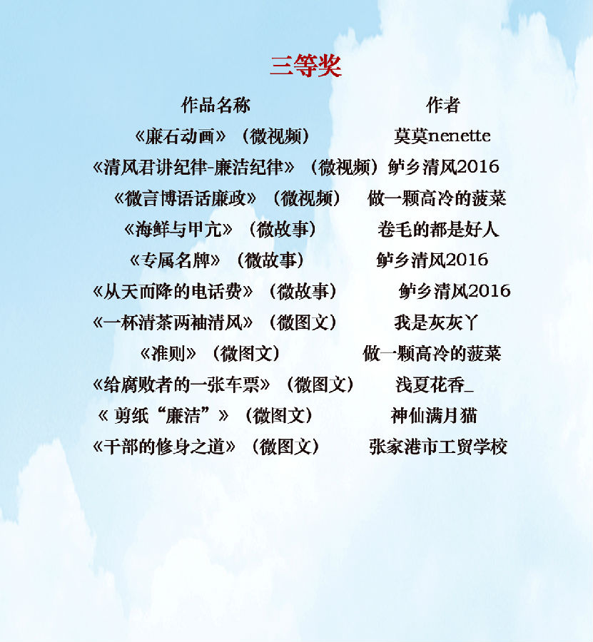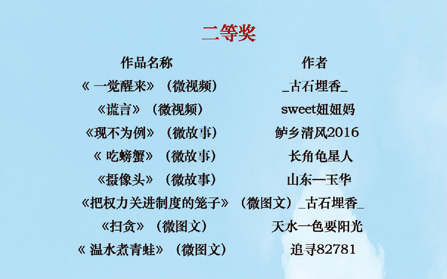 由苏州市纪委、监察局主办,相城区纪委、监察局承办,苏州日报报业集团全媒体中心协办的“廉石之光?阳澄清波”2016微言博语话廉政微作品征集活动自今年3月启动以来,得到了广大网友的积极响应和热情参与,活动组委会共收到各类微作品投稿800余件。经组委会组织专家评审,现将拟授奖作品公示如下。如对拟授奖作品的著作权存有疑议,请在8月19日17:00前向组委会办公室反映,电话:0512-68610329。