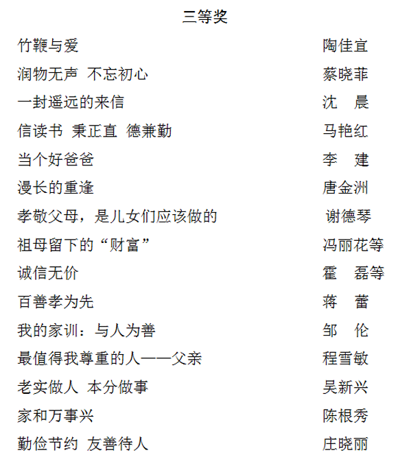由bet365足球即时比分、苏州市妇联主办,太仓市纪委监察局、太仓市妇联承办的“好声音讲述好故事——我的家风家规家训故事”征文诵读评选活动自今年6月启动以来,活动组委会共收到作品投稿400余件。经组织专家评审,现将获奖作品公布如下。组委会工作人员近期将与各位获奖作者联系领奖事宜。