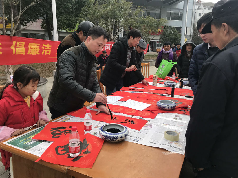 志愿者戴老师和孟先生在小区廉洁文化广场挥毫泼墨,为居民们书写新春的祝福。“处事公平平似水,为官廉洁洁如冰”“修身养德传家训,克己恭俭塑家风”“律己与自爱齐飞,勤政共清廉一色”“传统美德忠孝立家规,社会新风仁义传家训”……一副副立意新颖、寓意丰富的春联,弘扬着廉洁文化和优良家风,同时也传递着美好的新春祝福。